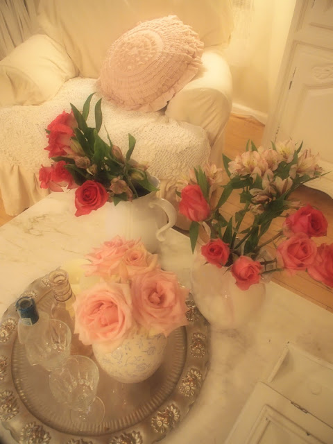I love to decorate with fresh flowers. Have several pink rose bushes in my garden, so usually have flowers on display all summer. Even one bud in a vase makes a big statement. Below are photos of some of my roses in thrift store vases. These just might be some of the last roses of the season. The light pink roses are perfect for a shabby chic decorating scheme.